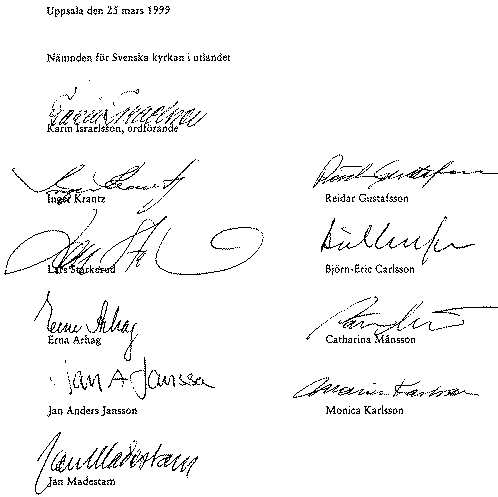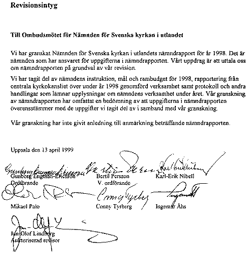 Arbetsutskottet har sammanträtt den 21 januari, 16 mars,19 maj, 13 augusti, 10 november, 11 december. Personalutskottet har sammanträtt den 30 januari (telefon), 2 februari, 27 februari (telefon), 13 mars (telefon), 31 mars, 17 april ( telefon). Tillsättningsutskottet har sammanträtt den 17 september och 12 oktober (telefon). Med tanke på denna omfattande och rörliga verksamhet som är SKUT:s på cirka fyrtiofem verksamhetsplatser i världen, där så många obekanta faktorer vid var och en av dessa spelar in för det totala resultatet, så är generellt sett årets resultat mycket gott och följer nära budget. SKUT:s gåvointäkter hemma har nästan nått upp till budget och utlandsverksamheten har fortsatt trenden att öka de lokala intäkterna och därmed möjligheterna att bära en större del av verksamhetskostnaderna. Huvuddelen av SKUT:s kostnader är relaterade till utlandspersonalen och genom vissa nedskärningar har de kostnaderna klarats trots normala löne- och kostnadshöjningar. Några ökningar av anslagen till utlandsfastigheterna har som vanligt och väntat skett, betingade av oförutsedda akuta reparations- och inventariebehov. Intäkter SKUT:s intäkter i Sverige består i huvudsak av ändamålsdestinerat och allmänt kyrkofondsanslag, kollekter, gåvor från arbetskretsar och enskilda, testamenten, församlingsanslag, finansiella intäkter. Årets utfall har på gåvo- och anslagssidan "tyvärr" följt budget mycket nära. Dvs. SKUT kan med tacksamhet konstatera att gåvor och anslag nästan nått upp till föregående års resultat, men alltså tyvärr inte mer än förväntat. Resultatet på gåvosidan är sedan länge ganska stabilt för SKUT:s del, arbetskretsar, enskilda givare och kollekter håller gåvorna på en nivå som inte oroväckande förändras, men tendensen är dock sakta minskande. Det ändamålsdestinerade kyrkofondsanslaget, som under sju år hållits på samma nivå, är kanske det mest oroväckande då detta främst är avsett att täcka SKUT:s utlandspersonals löner och lönerelaterade kostnader. SKUT:s huvudverksamhet kan förenklat beskrivas som till 70 procent vara personalförsörjning av utlandsverksamheten och därmed är kostnaderna automatiskt stigande. Intäkter, vilka inte syns i resultaträkningen, är dock av största betydelse för utlandsverksamheten och den samlade SKUT-verksamheten. Det handlar om respektive utlandskyrkas lokala intäkter, vilka utgör ca 40 procent av totalbudgeten. Här har skett en stadig ökning under lång tid vilket är ett bevis på ansvarstagande, inte minst hos de lokala mer eller mindre fasta församlingsmedlemmarna. Till årets extraordinära intäkter hör de ca 1 miljon kronor som blev resultatet av försäljning av lokaler i samband med den tidigare nedläggningen av verksamheten i Narvik. Lämnade anslag Utlandsverksamheten har även detta år fått vidkännas en minskning i de från SKUT utsända verksamhetsanslagen, vilka uppgick till 9,8 miljoner kronor. I denna summa ingår ramanslag till generella verksamheter, samt anslag till verksamhet utanför stationeringsorten, inventarier, underhåll och till fordonsbyte. Resterande 0,5 miljoner kronor utgör avskrivningar. Anslagen till utlandsverksamheten skall enligt SKUT:s målsättning minska i takt med att den lokala bärkraften kan öka, vilket hittills varit möjligt under en följd av år. Däremot kan inte anslag till underhåll och reparationer ligga kvar på de senare årens ovanligt låga nivå utan planeras öka vilket, bl.a. får ske genom att verksamhetsanslagen minskar. Övriga verksamhetskostnader Årets kostnader för nämnden har ökat på grund av beslutade extra sammanträden och utgörs främst av ökade resekostnader i Sverige, vilka dock kompenserats av minskade kostnader för resor till utlandet. Verksamheten i Sverige med information , insamling och ombudsutbildning har i stort följt vad som planerats, med vissa förändringar utifrån behoven, utöver överskridande för informationsmaterial och betydligt lägre intäkter från Ute och Hemma, i stort dock justerat inom enheternas ramar. Ett par ej genomförda ombudsutbildningar har sparats och planerats in under följande år. Här återfinns även det samarbete med tidningsdistribution till utlandskyrkorna m.fl. som sker med Handelsflottans kultur- och fritidsråd och där distributionsstörningar i början av året gav mindre kostnader än budgeterat. Personalkostnader De fördelade kanslikostnaderna, som också omfattar kanslipersonalen, är centralt budgeterade och avhängiga de av förvaltningsdelegationen fastställda gemensamma nyckeltalen och procentuella utnyttjandet av personal från övriga avdelningar. Nämnden avser under det kommande året följa upp utvecklingen av dessa kostnader. Här framgår att de huvudsakliga personalkostnaderna i SKUT härrör sig till utlandspersonalen som är fördelade på i första hand löner ock därmed relaterade kostnader, vilka väl har följt årets budget. Därtill kommer de kostnader som ingår i rekrytering, sändning och fortbildning, vilka enligt nämndens mål har ökat i enlighet med budget. Beroende på oförutsägbarheten i fråga om det årliga antalet rekryteringar, har introduktionskostnader något överskridit budget medan annonskostnader underskridit. Erhållna bidrag för arbetskraft består av lokalt insamlade medel till bekostande av löner. Finansiella intäkter och kostnader De finansiella intäkterna har blivit markant högre än budget, tack vare god och lyckosam finansförvaltning under året. Vissa reservationer har gjorts av årets medel avsedda för tryckning av material som blir klara först påföljande år. Jan Madestam Resultatrapport verksamhetsåret 1998 Nämnden för Svenska kyrkan i utlandet