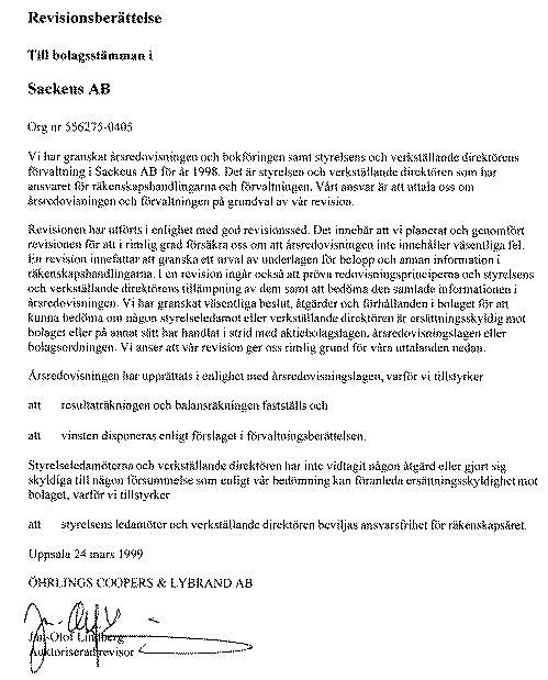 Styrelsen och VD för Sackeus AB får härmed avge årsredovisning för räkenskapsåret 1998, bolagets trettonde verksamhetsår.